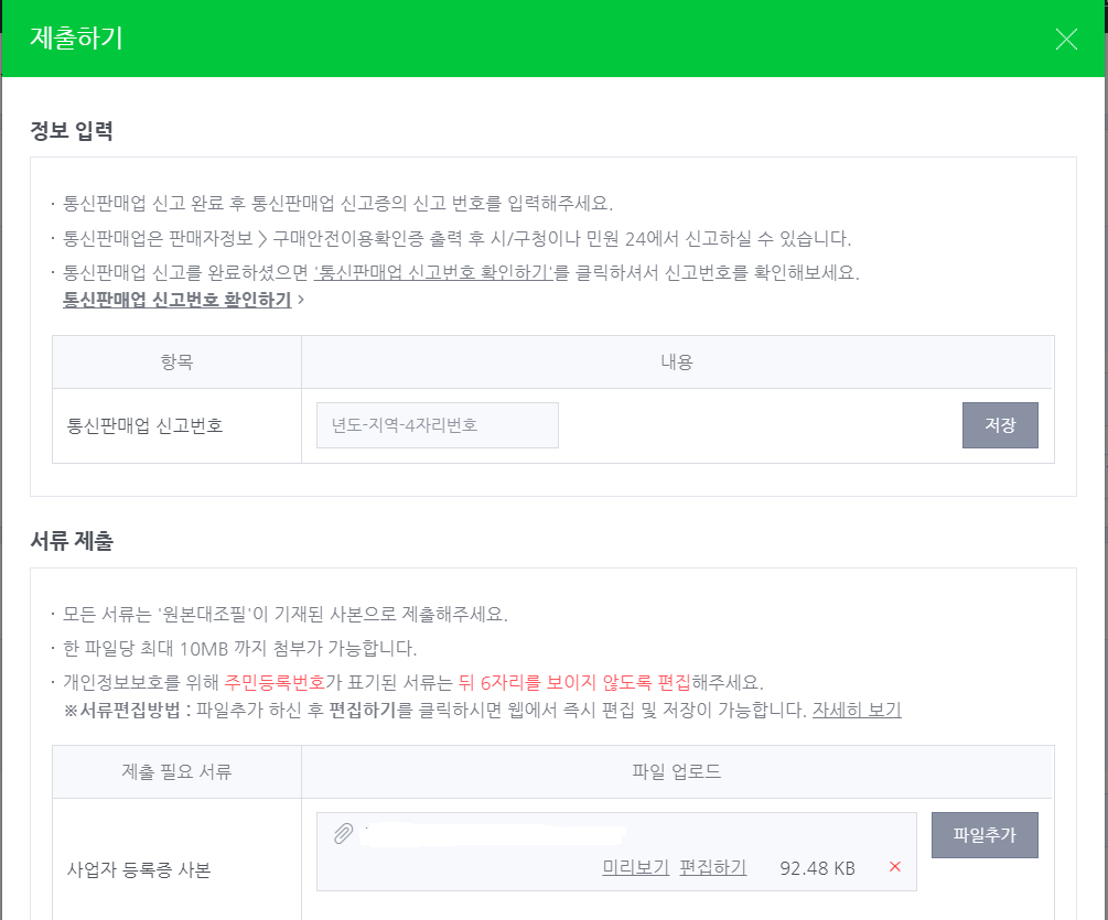 받아온 통신판매업 신고번호를 입력하시고 사업자등록증,
